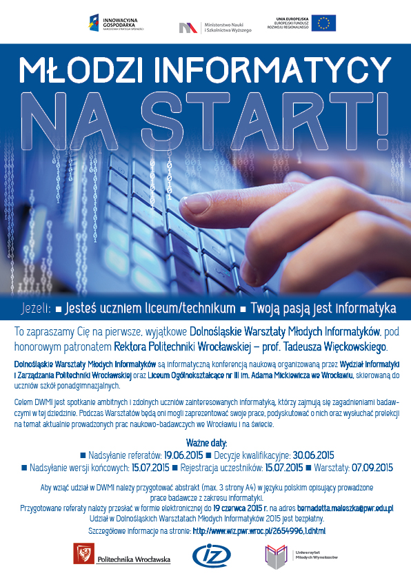 to 7 września 2015r zapraszamy Cię na pierwsze, wyjątkowe Dolnośląskie Warsztaty Młodych Informatyków, pod honorowym patronatem Prezydenta Miasta Wrocławia Rafała Dutkiewicza, Rektora Politechniki Wrocławskiej - prof. Tadeusza Więckowskiego oraz Dziekana Wydziału Informatyki i Zarządzania - prof. Zdzisława Szalbierza.